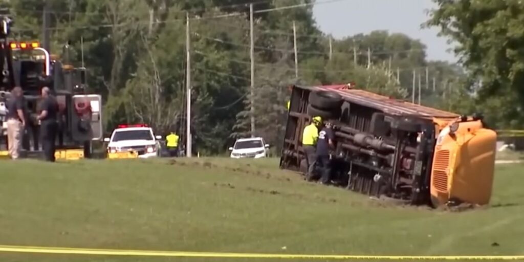 News video from WCMH-TV showed the bus laying on its side in a grassy area off of Route 41.