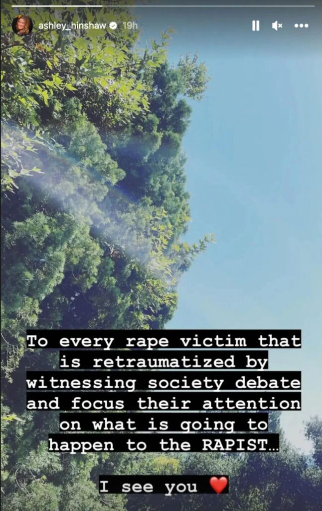 “To every rape victim that is that is retraumatized by witnessing society debate and focus their attention on what is going to happen to the RAPIST… I see you,” Hinshaw wrote in an Instagram Story on Friday.