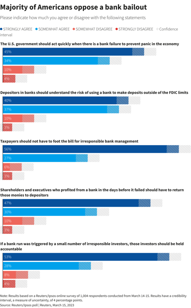 WASHINGTON, March 15 (Reuters) – A bipartisan majority of Americans oppose U.S. taxpayers footing the bill when bad management causes a bank to fail, though Republican opposition to bank bailouts has softened over the last decade, a Reuters/Ipsos poll completed on Wednesday found.