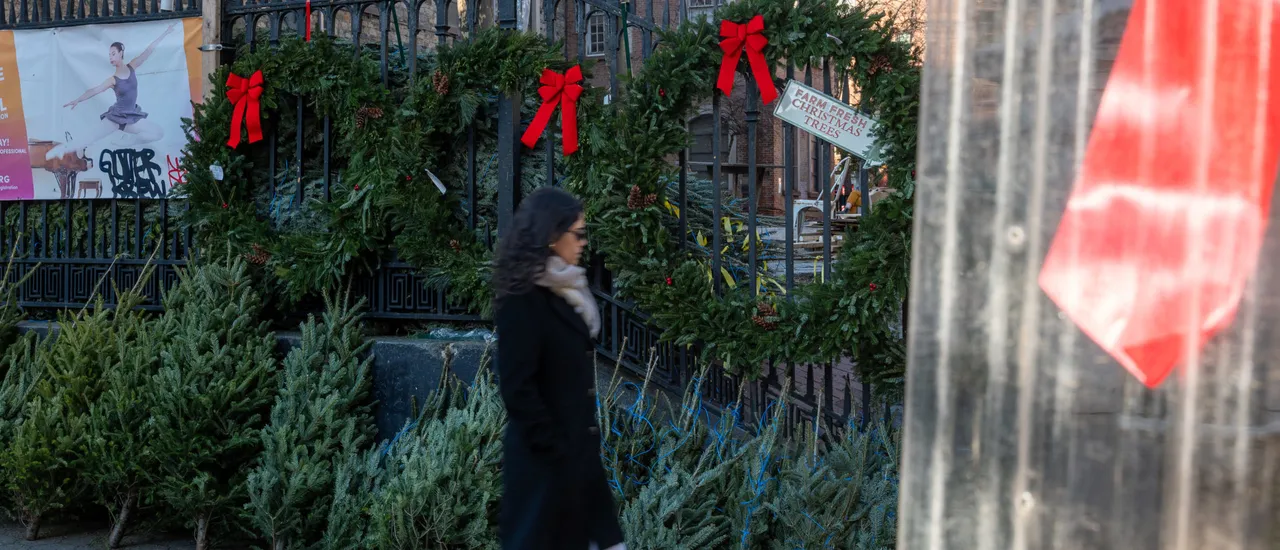 NEW YORK, NEW YORK – DECEMBER 03: Christmas trees and wreaths are sold by Tree Riders NYC at their location in the East Village in Manhattan on December 03, 2025, in New York City. (Photo by Spencer Platt/Getty Images)