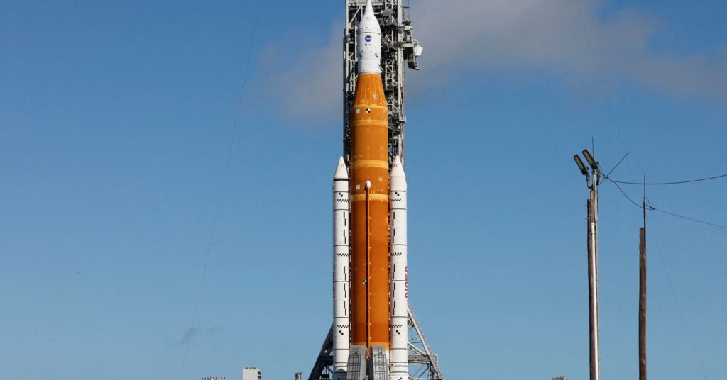 [1/3] NASA’s next-generation moon rocket, the Space Launch System (SLS) rocket with its Orion crew capsule perched on top, is shown on its launch pad as it is prepared for launch in Cape Canaveral, Florida, U.S. November 12, 2022. REUTERS/Joe Skipper/File Photo