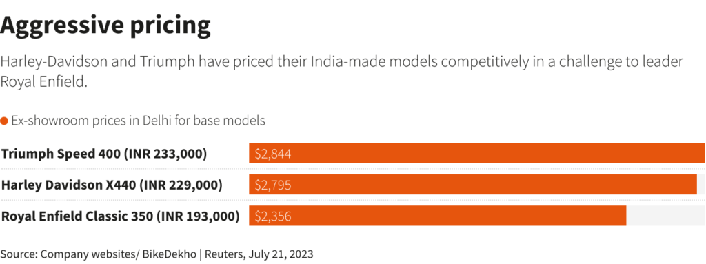 BENGALURU, July 23 (Reuters) – U.S. big-bike maker Harley-Davidson (HOG.N) and British rival Triumph have revved up India’s premium motorcycle market with aggressively priced models that analysts said could dent the over half-century dominance of local champion Royal Enfield.