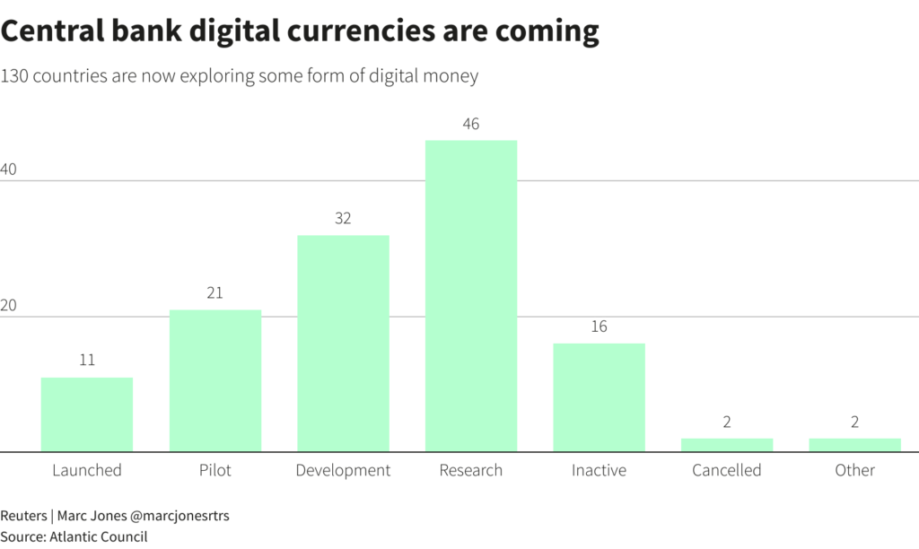 A few countries have introduced central bank digital currencies (CBDCs), China is trialling a prototype yuan with 200 million users, India is gearing up for a pilot and some 130 countries representing 98% of the global economy are exploring digital cash.