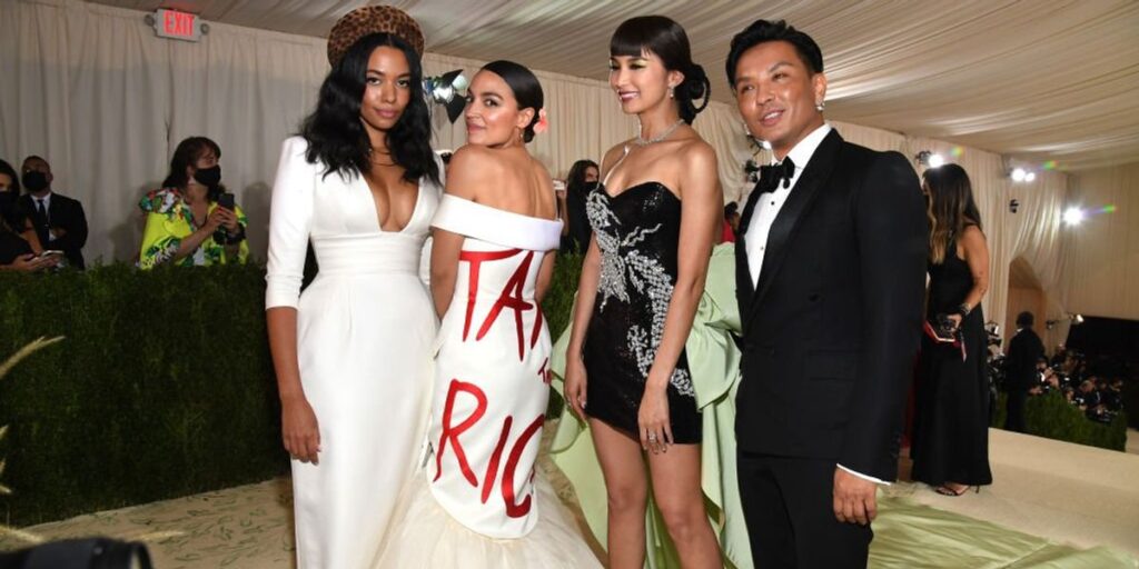 AOC made headlines for attending the fashion event for elites while wearing a Brother Vellies white dress with “Tax the Rich” written in red on the back.