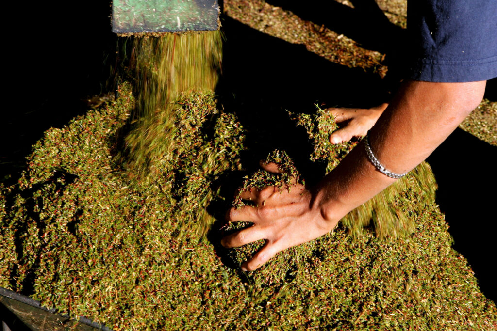 A farmworker mixes piles of raw Rooibos tea as it emerges from a thresher at a processing plant in the remote mountains of the Cedarberg region, about 300km (186 miles) north of [Cape Town], March 30, 2006./File Photo Acquire Licensing Rights