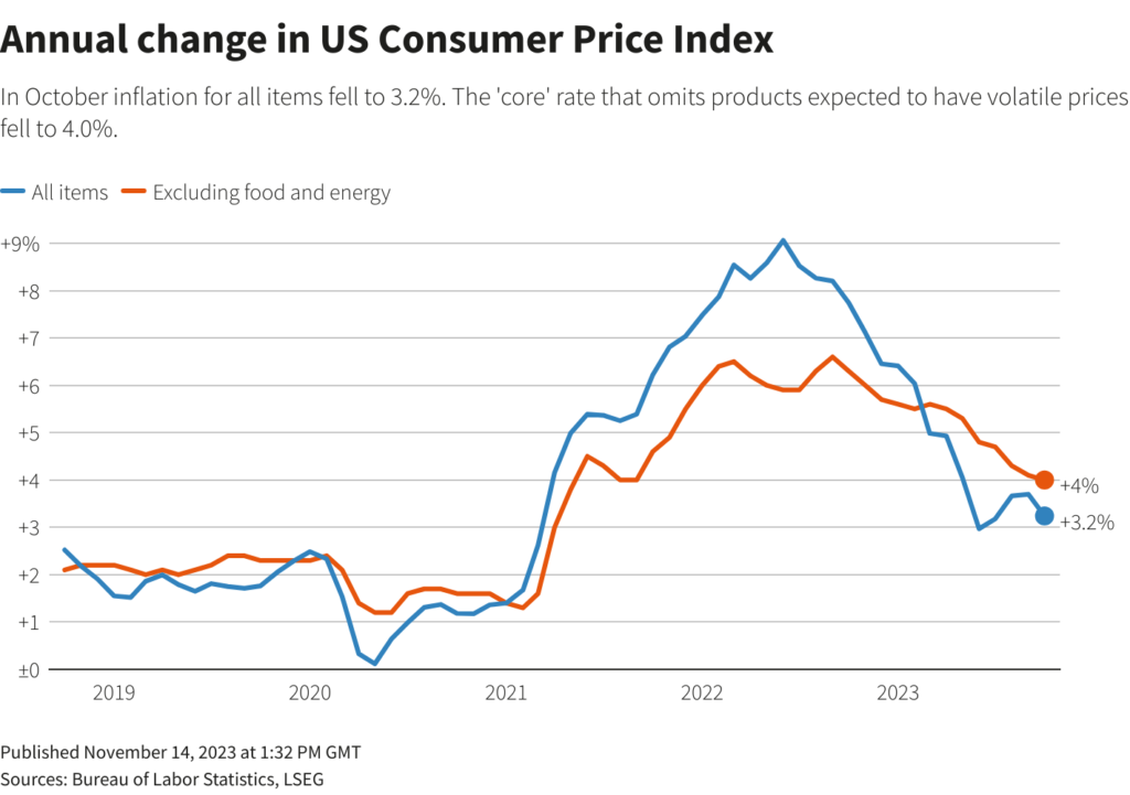 LONDON, Nov 15 (Reuters) – The scale of the debt market reaction to October’s U.S. inflation undershoot partly reflects sheer relief in what’s now one of the biggest bond market bets of the century so far.