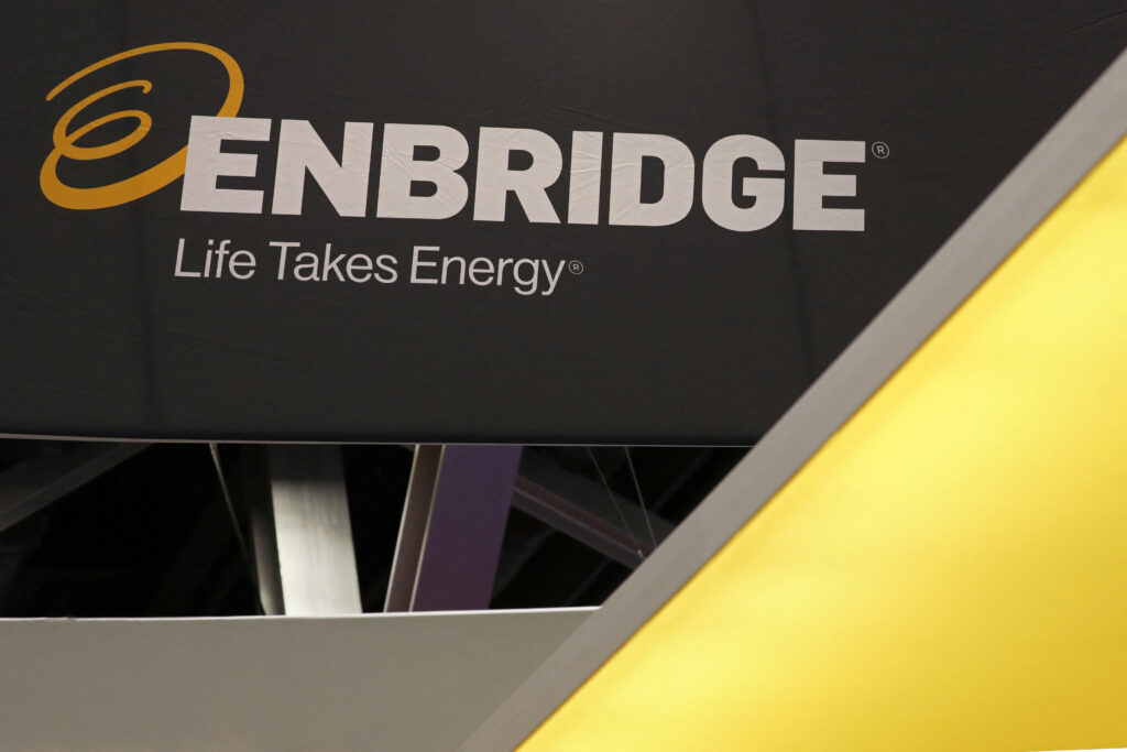 The logo of Calgary-based Enbridge, one of North America’s largest energy infrastructure companies, is displayed during the LNG 2023 energy trade show in Vancouver, British Columbia, Canada, July 12, 2023. REUTERS/Chris Helgren/File Photo Acquire Licensing Rights