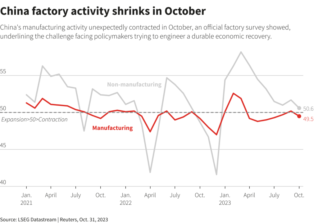 BEIJING, Oct 31 (Reuters) – China’s manufacturing activity unexpectedly contracted in October, underlining the daunting task facing policymakers as they try to revitalise economic growth heading into the end of the year and 2024 amid multiple challenges at home and abroad.