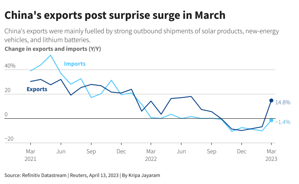 Exports in March shot up 14.8% from a year ago, snapping five straight months of declines and stunning economists who predicted a 7.0% fall in a Reuters poll.