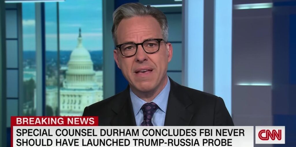 CNN anchor Jake Tapper admitted Monday that John Durham’s report investigating the origins of the FBI’s Trump-Russia probe is “devastating” for the FBI.
