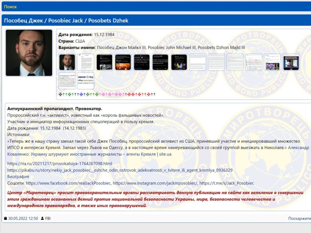 The shadowy organisation behind the list, which claims to act independently from the Ukrainian state, describes Posobiec as a “pro-Russian activist”, a “provocateur”, and recommends that law enforcement agencies consider his statements as “deliberate acts against the national security of Ukraine, peace, the security of humanity and international law and order, as well as other offences.”