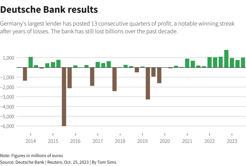 Though earnings dropped, Deutsche recorded its 13th consecutive profitable quarter, a notable streak after years of hefty losses.