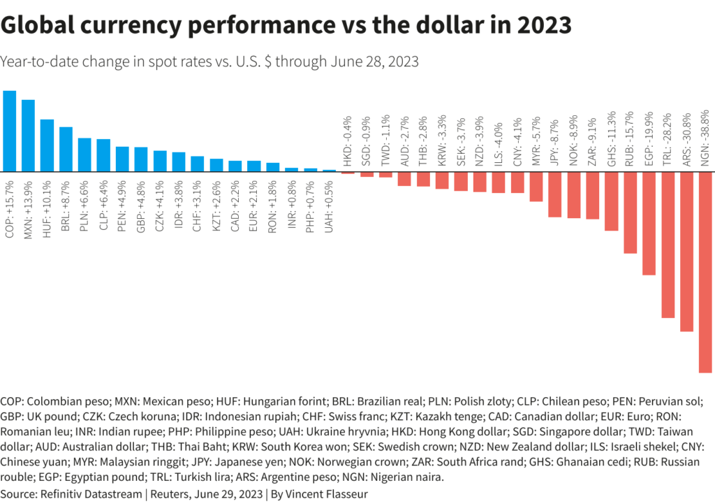 NEW YORK, June 29 (Reuters) – The U.S. dollar index climbed to a two-week high on Thursday after economic data showed the labor market remained on a solid footing, giving the Federal Reserve a possible cushion to continue raising interest rates.