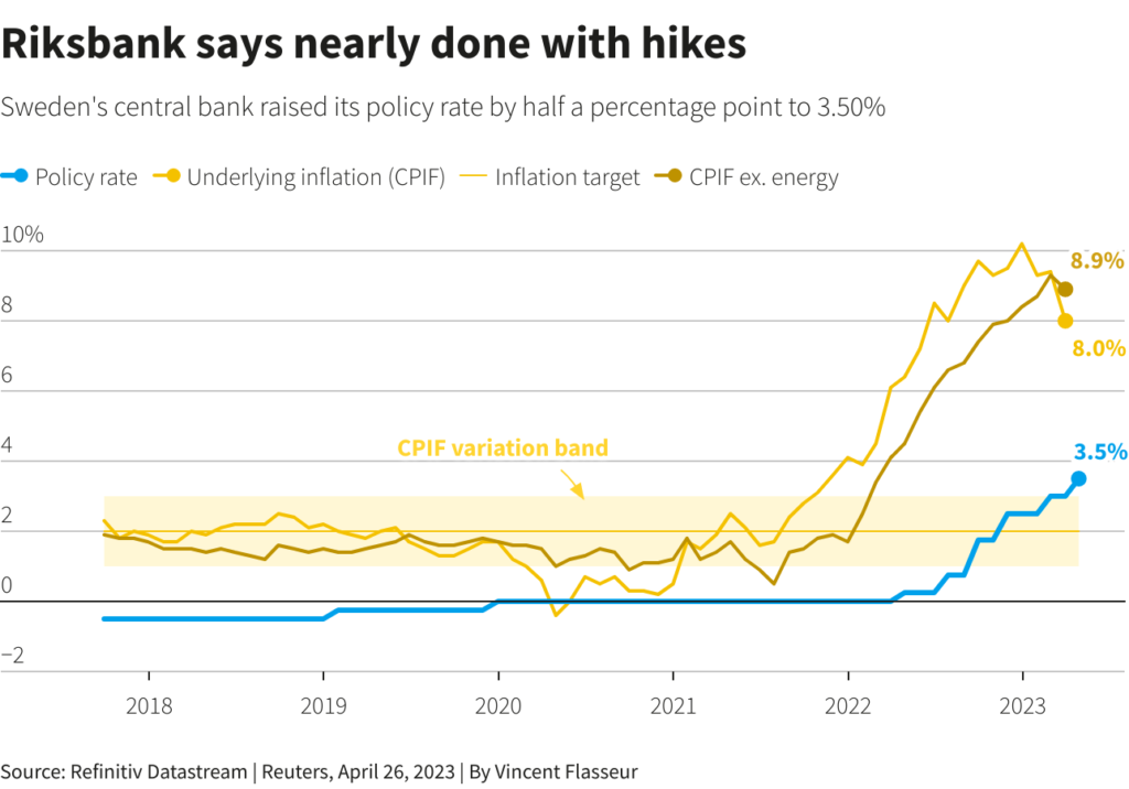 Sweden’s central bank raised its policy rate by half a percentage point to 3.50% in line with market forecasts, and said it expected a further hike at its meeting in June or in September, but two deputy governors voted for a smaller hike.