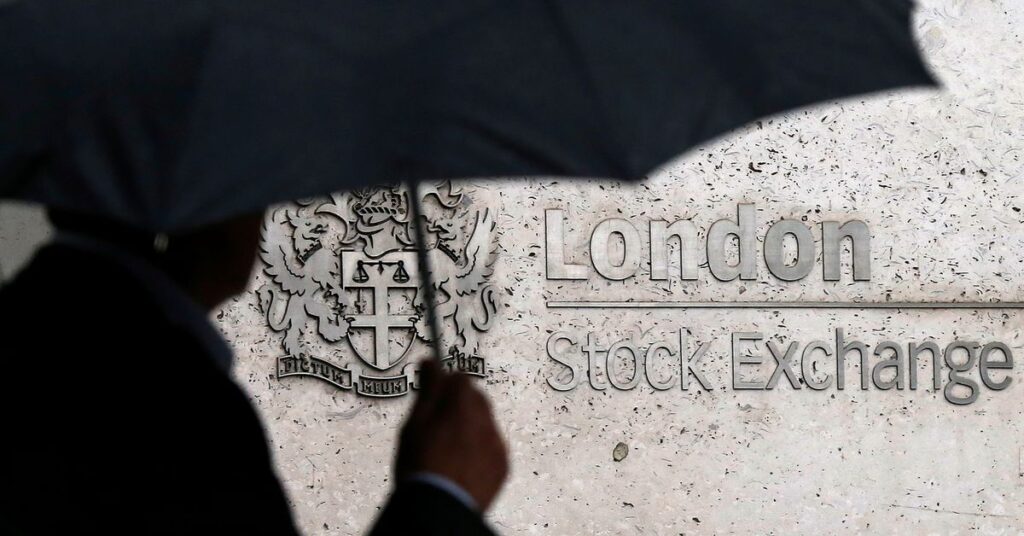 [1/3]A man shelters under an umbrella as he walks past the London Stock Exchange in London, Britain, August 24, 2015. REUTERS/Suzanne Plunkett/File Photo