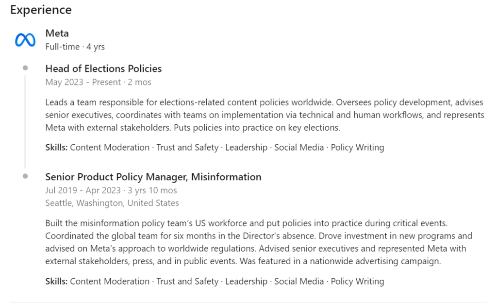 Leads a team responsible for elections-related content policies worldwide. Oversees policy development, advises senior executives, coordinates with teams on implementation via technical and human workflows, and represents Meta with external stakeholders. Puts policies into practice on key elections.