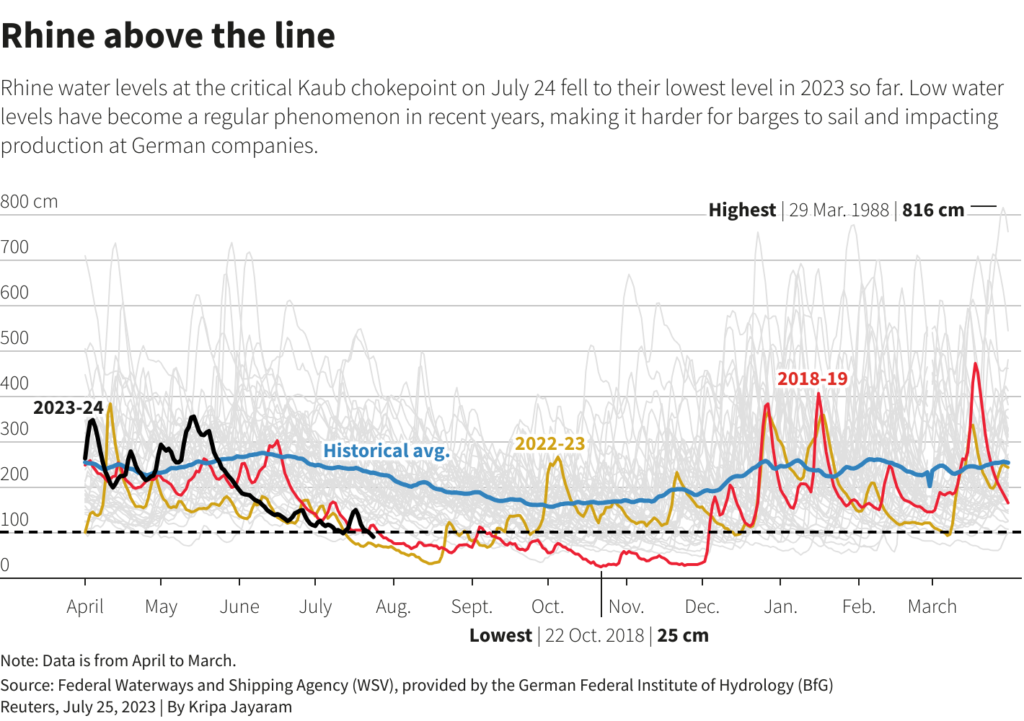 As a rule of thumb, if water levels at Kaub fall below 78 centimetres for 30 straight days, as was the case in 2022 and 2018, industrial production falls by 1%, according to the Kiel Institute for the World Economy.