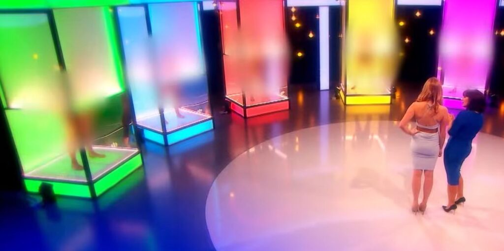 Over the course of an episode, the “chooser” critiques the six bodies, genitalia and all. Gradually, screens obscuring the upper portions of the potential dates’ bodies rise, eventually exposing their faces.