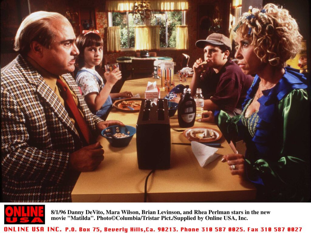 1996 Danny DeVito, Mara Wilson, Brian Levinson, and Rhea Perlman stars in the new movie “Matilda”