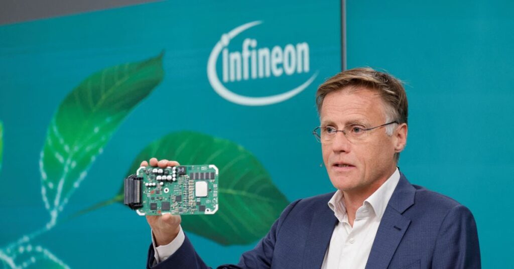 [1/6]Infineon CEO Jochen Hanebeck holds up an Infineon Aurix-Microcontroller during the annual results news conference in Munich, Germany, November 15, 2023. REUTERS/Michaela Rehle Acquire Licensing Rights