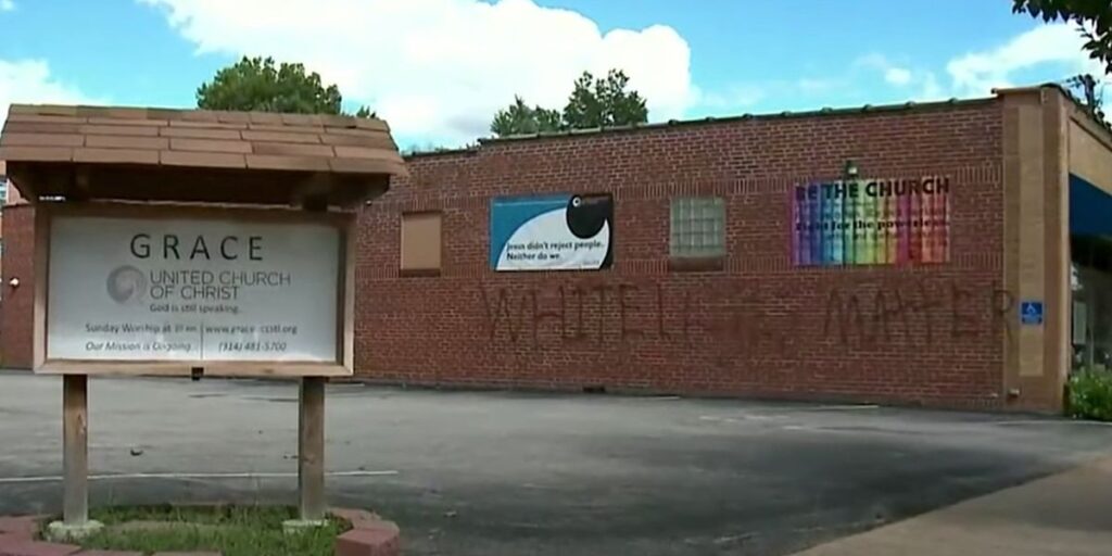 A liberal church in Missouri was vandalized with the message “White Lives Matter” spray-painted on a brick wall under progressive church posters.
