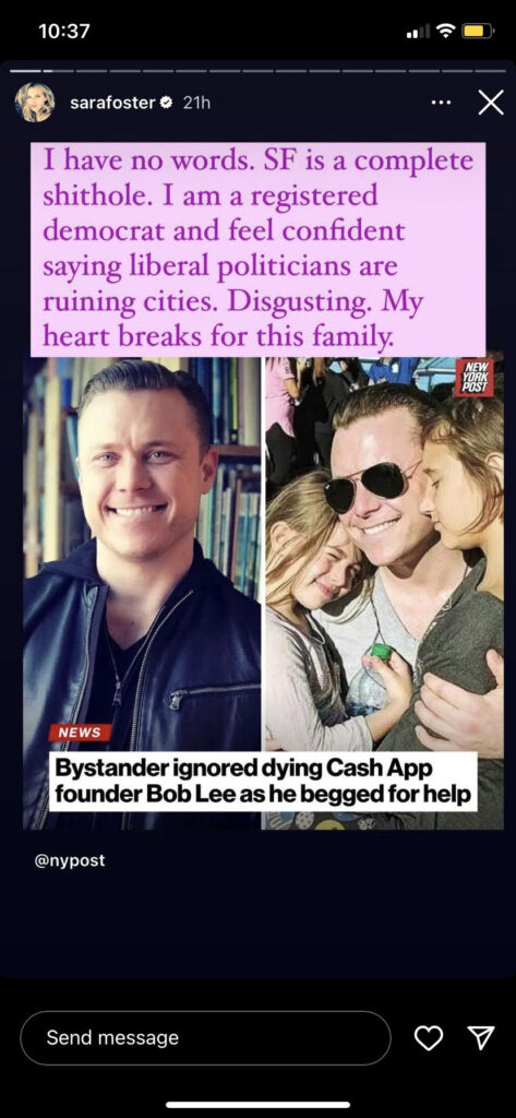 Her post featured a screenshot of an article apparently from the New York Post with the headline, “Bystander ignored dying Cash App founder Bob Lee as he begged for help.”