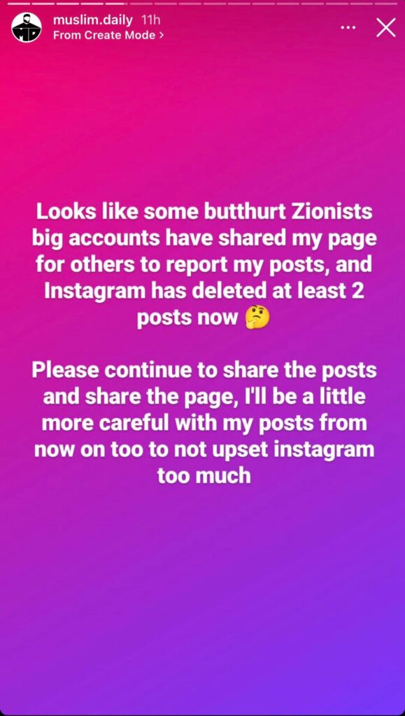 Update: “Muslim Daily” posted a note to its Instagram “story” complaining that its posts were being deleted: