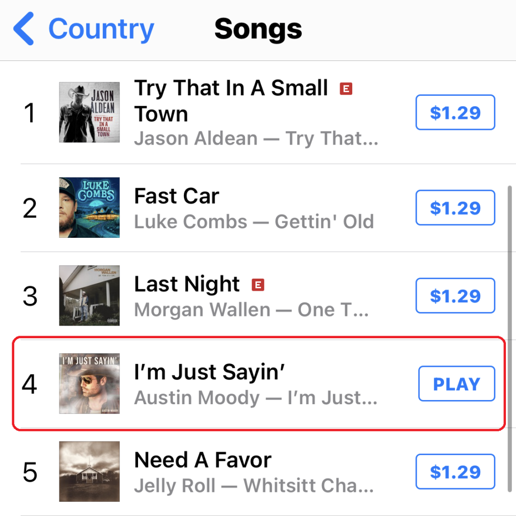 Nashville country artist Austin Moody never thought he’d have a song in the top five on country music iTunes charts. But after being featured on breitbart, that’s exactly what happened to the young crooner, procuring him the number four spot, amidst industry megastars Jason Aldean, Luke Combs, and Morgan Wallen. But according to the humble rising star, the success of his smash hit, “I’m Just Sayin,’” is “driven by fans. That’s who dictates where this thing is landing on the charts.”