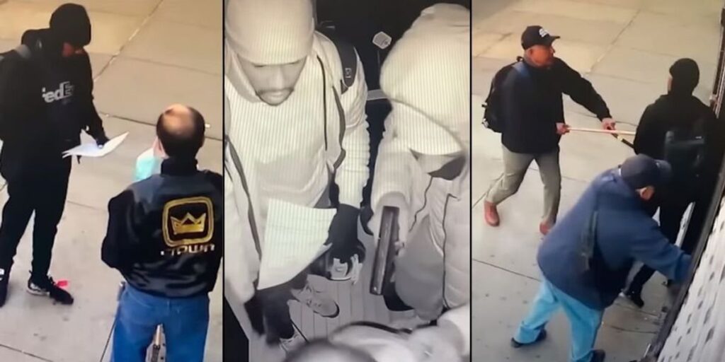 An elderly couple in New York City was beaten and threatened by armed robbers pretending to be FedEx delivery men, but the robbery was thwarted by two street cleaners who happened to be walking by at the right time.