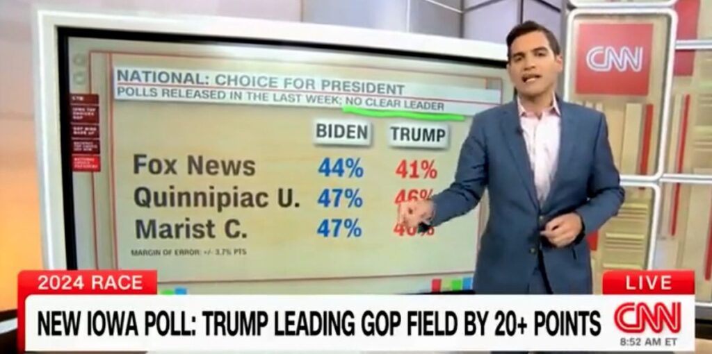 Showing three recent polls surveying a Trump-Biden rematch, Enten observed that Trump and Biden remain in a statistical tie. In some polls, President Joe Biden leads, and in others, Trump leads.