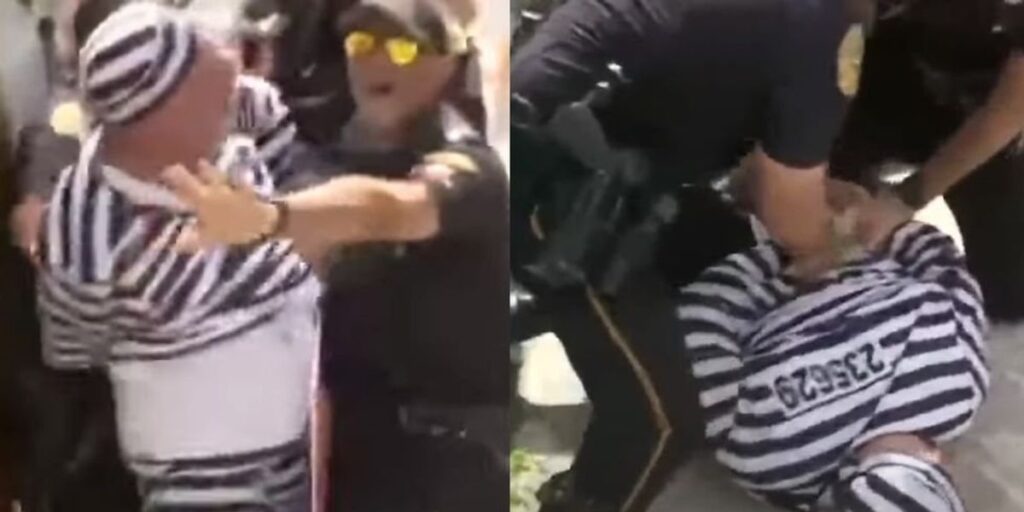 Home»Politics»Protester tackled and arrested for rushing at Trump’s motorcade with a protest sign after arraignment in Miami