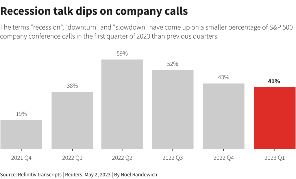 Terms related to an economic downturn have been uttered less on quarterly earnings calls in the past few weeks than in the previous few reporting seasons, according to a Reuters analysis of S&P 500 conference call transcripts.