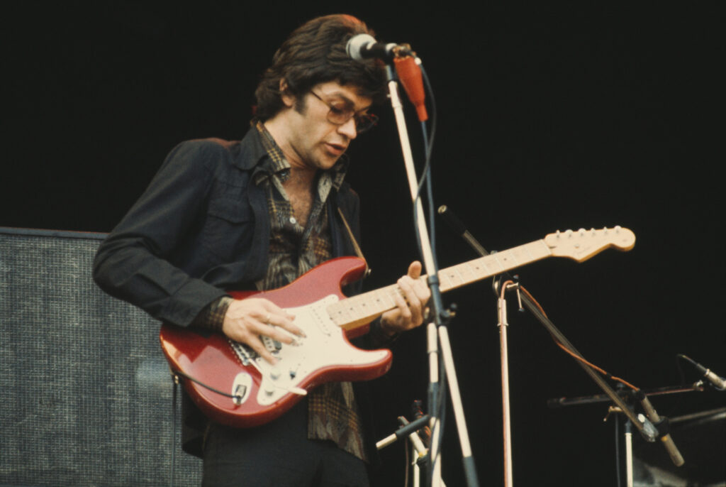 Canadian singer-songwriter and guitarist Robbie Robertson performing with The Band at Wembley, London, on September 14, 1974. (Michael Putland/Getty Images)