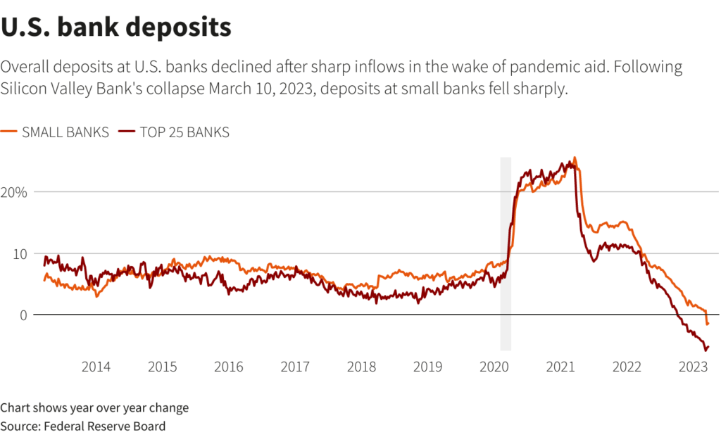 Overall U.S. bank deposits have been in decline after sharply rising in the wake of pandemic aid in 2020 and early 2021.