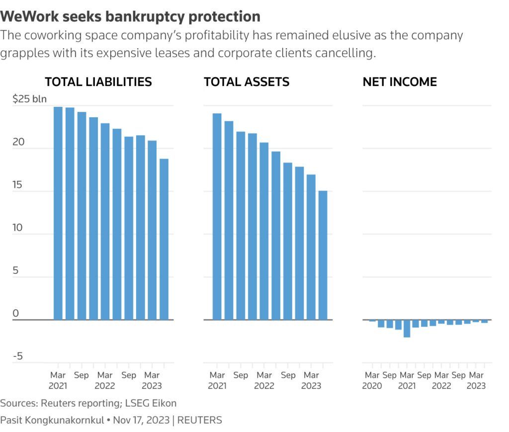 Profitability has remained elusive, as WeWork grapples with expensive leases and corporate clients cancelling because of a trend toward employees working from home. Paying for space consumed 74% of WeWork’s revenue in the second quarter of 2023, the last time it reported financial results.