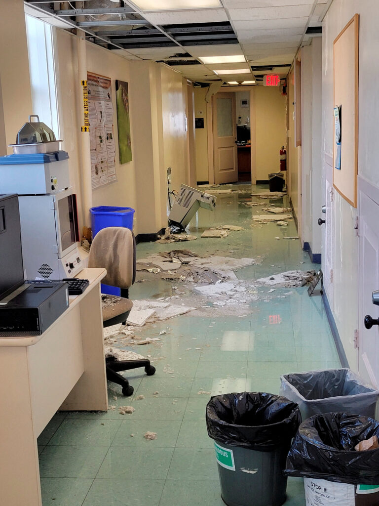 A damaged hallway in the U.S. Department of Agriculture’s (USDA) Beltsville Agricultural Research Center (BARC) is seen in a photo taken by an employee after a 2022 Christmas Day flood and ceiling collapses at the research facility, where employees have now filed whistleblower complaints over working conditions, in Beltsville,… Acquire Licensing Rights
