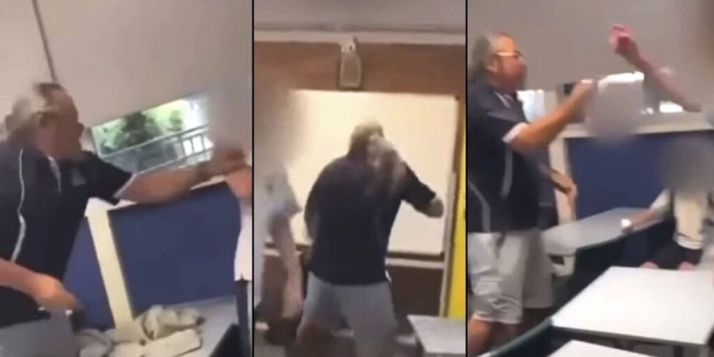 Cellphone video showed the teacher, 62-year-old Michael Kable, throwing paper balls at some students, who throw them back. The interaction became physical and at some point, a student threw a table at him.