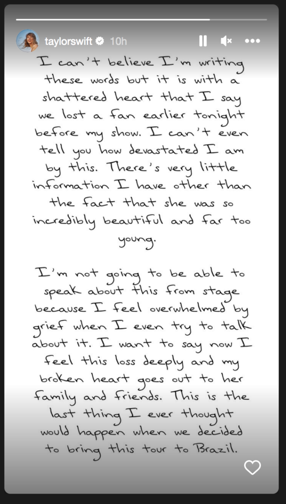 Online news site G1 reported that one of Benevides’ friends, who attended the concert with her, said her friend passed out at the beginning of the concert, as Swift performed her second song, “Cruel Summer.”