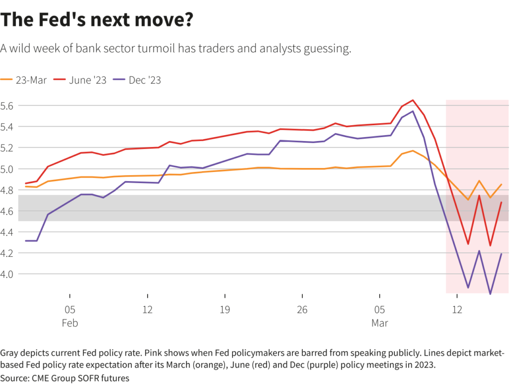 Traders now see next week as a tossup between a smaller quarter-point hike and a pause, with rate cuts seen likely in following months as the turbulence at Credit Suisse renewed fears of a banking crisis that could cripple the U.S. economy.