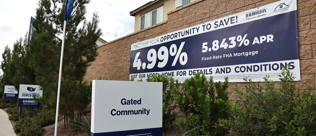FONTANA, CALIFORNIA – SEPTEMBER 17: A sign advertises mortgage rates for new homes in a gated community on September 17, 2025 in Fontana, California. (Photo by Mario Tama/Getty Images)