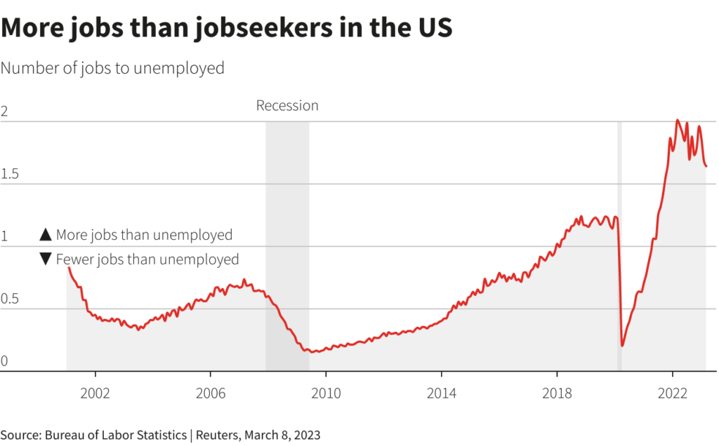 New data for March showed the ratio of job openings to the number of unemployed job seekers fell for the fourth consecutive month and hit the lowest level since October 2021.