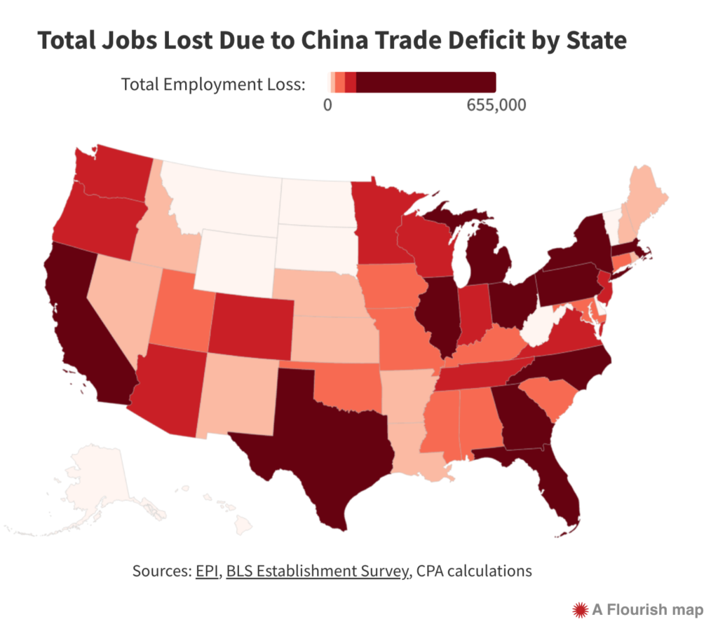 Those massive job losses have coincided with a booming U.S.-China trade deficit.
