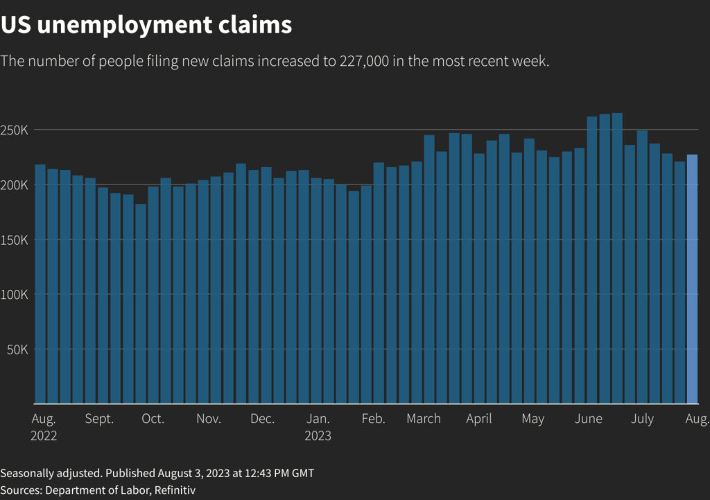 WASHINGTON, Aug 3 (Reuters) – The number of Americans filing new claims for unemployment benefits rose slightly last week, while layoffs dropped to an 11-month low in July as labor market conditions remain tight.