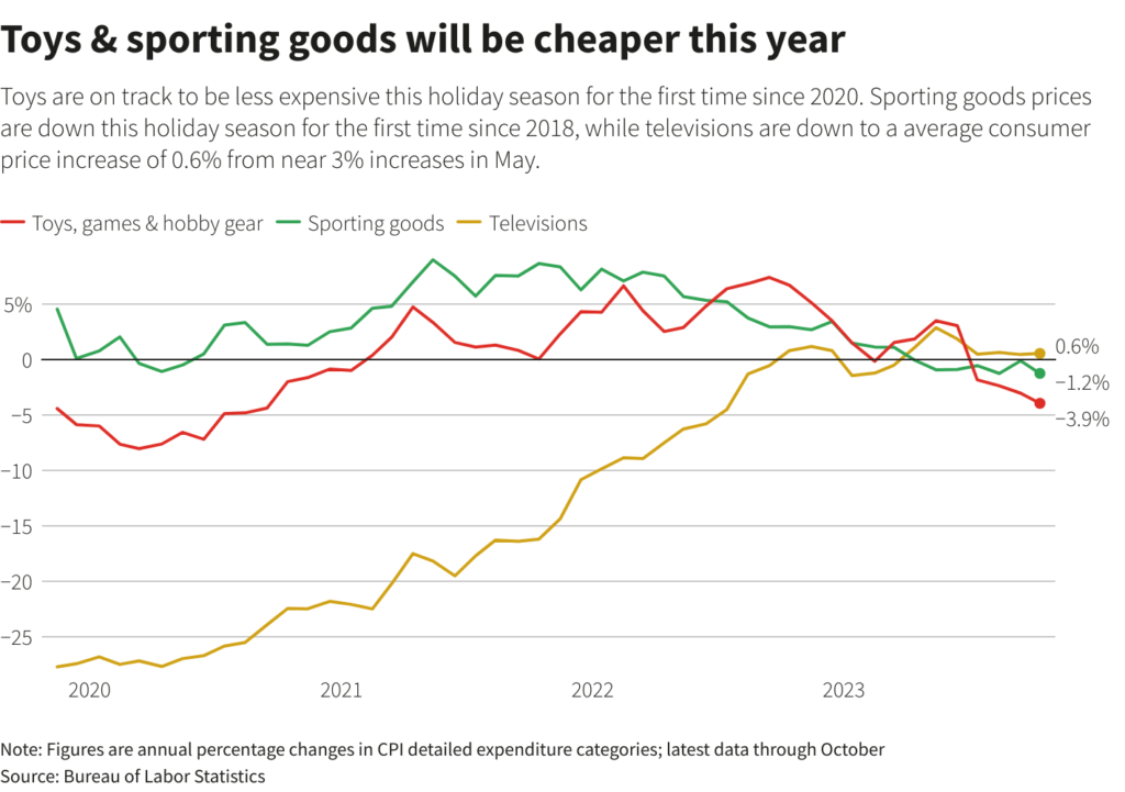Toys, games and hobby gear are on track to be less expensive this holiday season for the first time since 2020, while sporting goods prices are down this holiday for the first time since 2018, data from the Bureau of Labor Statistics (BLS)showed.