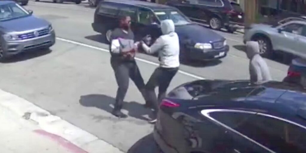 In the video,he victim is seen getting out of his car parked on Piedmont Avenue when two assailants drive up alongside and then push him onto the sidewalk. One of the two males in sweatshirts appears to have what looks like a gun as they take the keys from the victim’s hand and turn to his car.