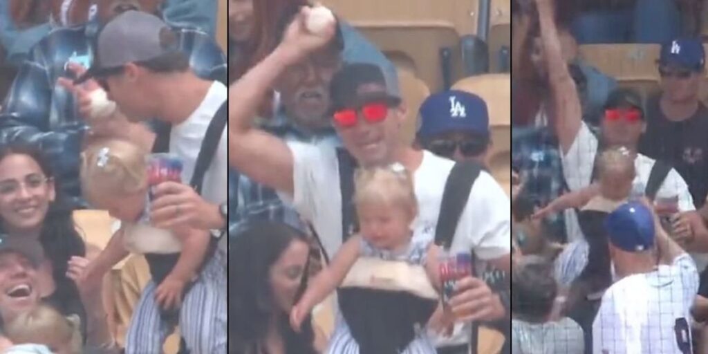 A Los Angeles Dodgers fan was praised online after video showed him catching a baseball with his bare hand while carrying his baby —without spilling the beer in his other hand.
