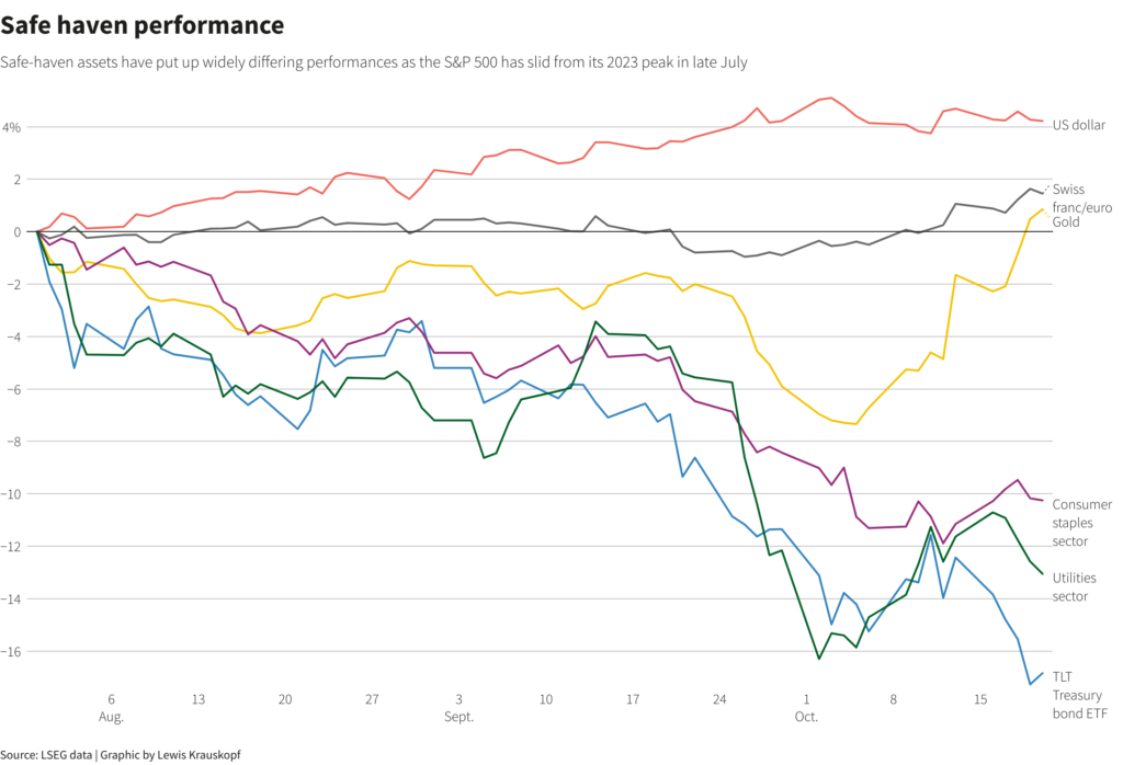 NEW YORK, Oct 20 (Reuters) – Growing volatility in U.S. stocks is driving a search for defensive assets, though investors may have fewer places to hide this time around.