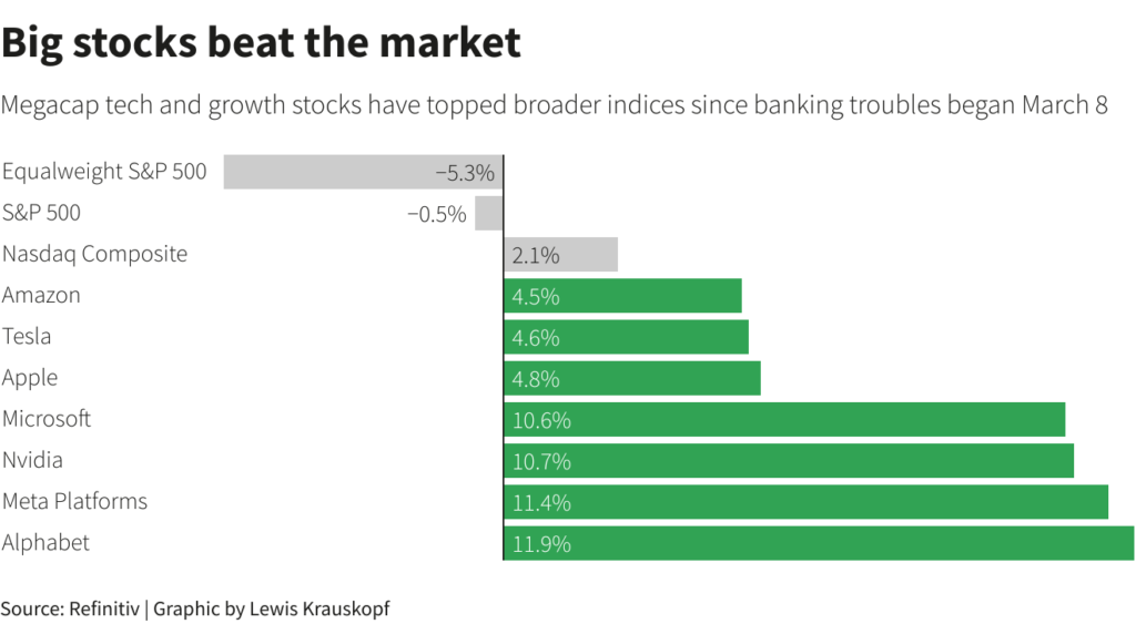 The performance of megacaps could suffer if banking worries ease and investors scoop up economically sensitive stocks that have struggled. The S&P 500 energy sector (.SPNY) is down 7.5% since March 8, while the industrials sector (.SPLRCI) is off 5%.