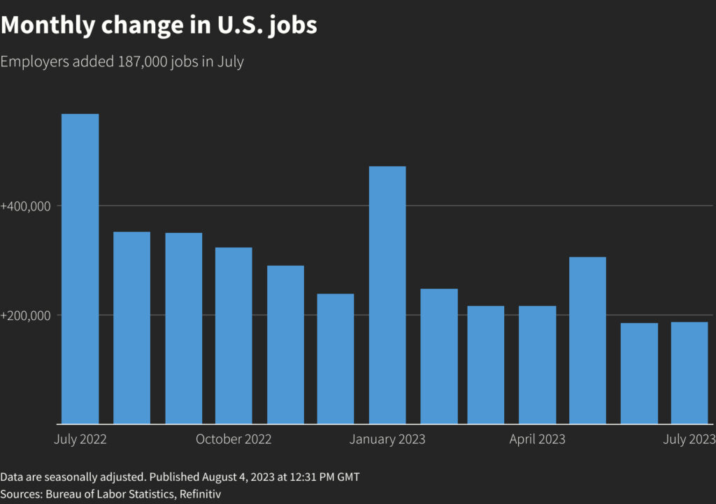 The Labor Department reported that U.S. employers added 187,000 jobs in July. Data for June additions was revised lower to 185,000 jobs, from 209,000 reported previously.