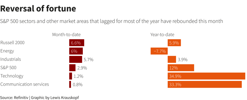 A broadening equity rally would be a welcome development for many investors, who have worried about the market’s narrow leadership. Just seven stocks – Apple Inc (AAPL.O), Microsoft Corp (MSFT.O), Alphabet Inc (GOOGL.O), Amazon.com Inc (AMZN.O), Nvidia Corp (NVDA.O), Meta Platforms Inc (META.O), and Tesla Inc (TSLA.O) – have been responsible for almost all of the S&P 500’s gains this year, data from S&P Dow Jones Indices showed.